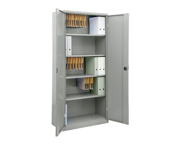 De kast wordt geleverd met 4 verstelbare systeemlegborden, geschikt voor laterale hangmappen en tot 5 rijen ordners. Dankzij het Eurolocks-slot met 3-puntsvergrendeling en 2 sleutels is de inhoud veilig opgeborgen. De krasvaste poedercoating zorgt bovendien voor een lange levensduur.